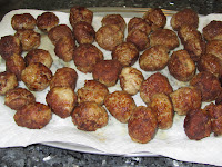 Pour the oil into a large skillet. Heat the oil. In batches (do not crowd) place the meatballs and brown them on all sides ~8-10 minutes. Remove the meatballs to a plate or tray that is covered with a paper towel. Discard the oil and put the pan back on the burner. Now on to the sauce...